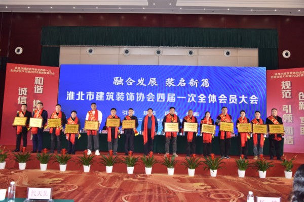 2026年1月30日下午,淮北市建筑装饰协会四届一次全体会员大会在淮北市淮矿集团会议中心隆重召开。本次大会以“融合发展 装启新篇”为主题,汇聚了市直有关部门领导、特邀友好商协会嘉宾及协会全体会员等240余人,共同回顾2025年工作成果,谋划2026年行业发展新蓝图。